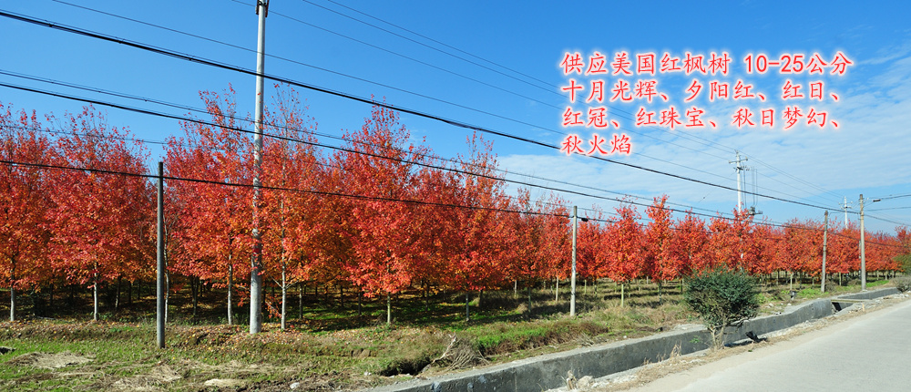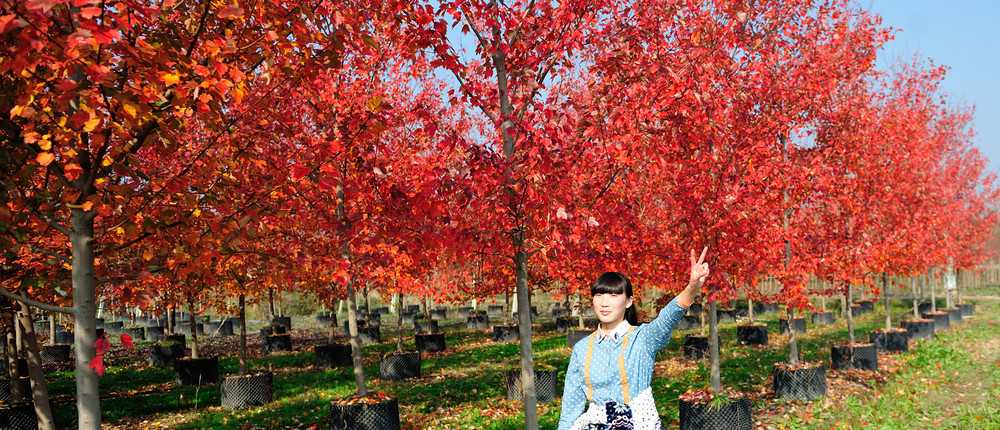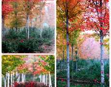 在華石紅楓基地里,引進的美國紅楓園藝變種已達三十余個,現(xiàn)已推廣的品種有‘夕陽紅’、‘十月光輝’、‘秋日烈焰’、‘秋焰槭’、‘太陽谷’、‘酒紅’、‘四季紅’、‘紅酒佳人’、‘擎天柱’、‘新世紀’、‘北方之火’、‘俏江南’, 已初具規(guī)模,獨資苗圃達12000畝,在全國還有近萬畝的合作紅楓種植基地,美國紅楓的每個園藝品種秋葉色彩鮮明,各具特色。目前華石紅楓基地可提供各個改良品種的樹徑5至20公分的大苗,有地栽苗與也有容器精品苗。